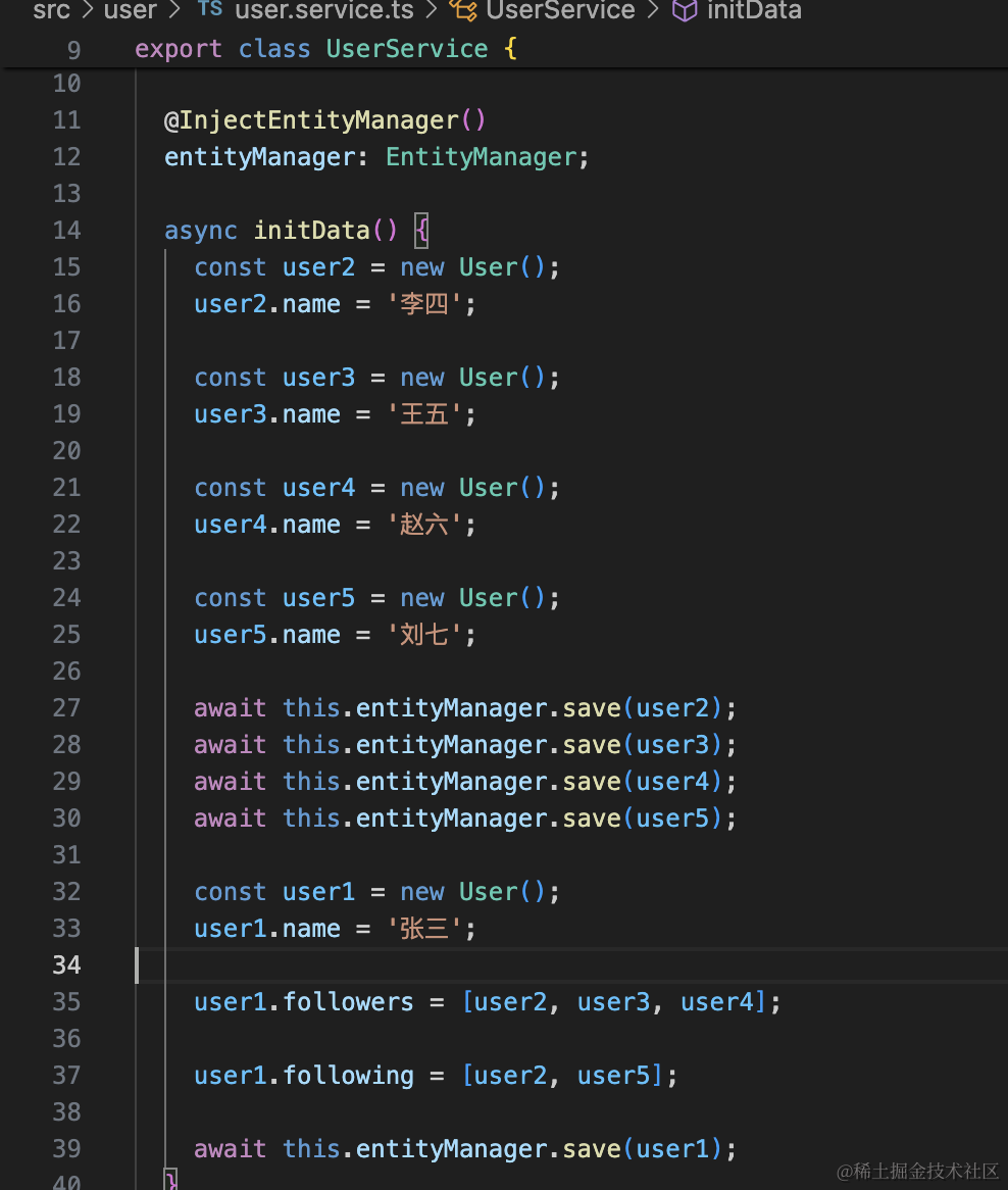 先查询出 user 的数据,在 followers 添加 user2,然后 save 保存到数据库。