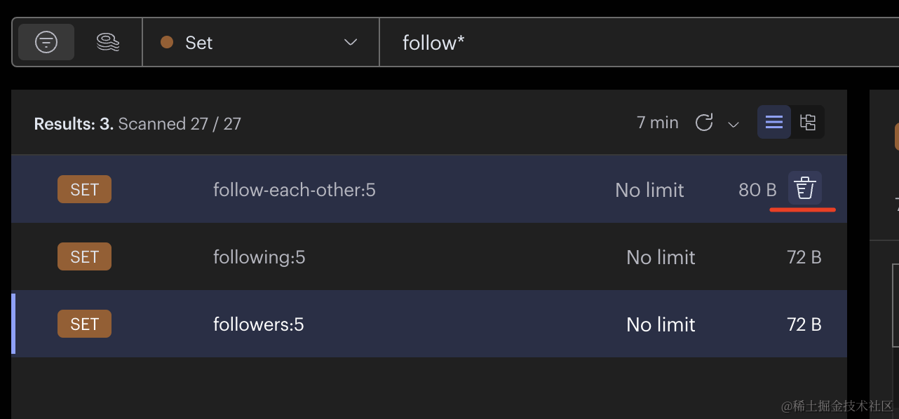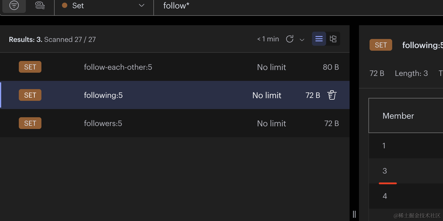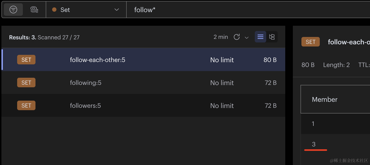 然后返回关注者或者关注的人的时候,用 SISMEMBER 判断下用户是否在 follow-each-other:1 这个集合中,是的话就可以标记出互相关注。