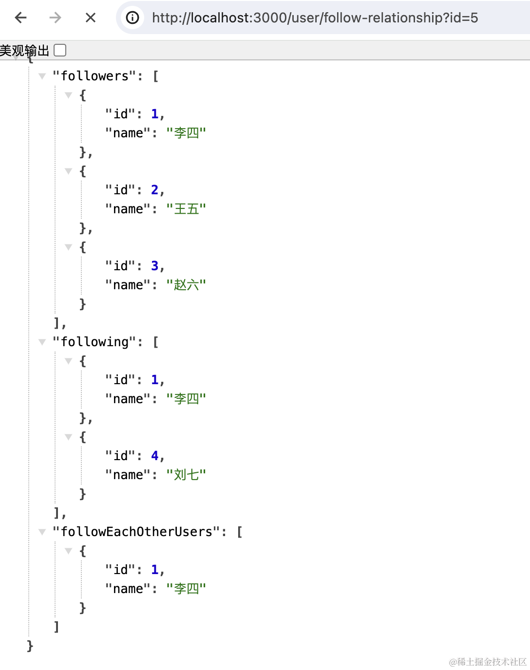 最后把 followers、following 还有求出来的相互关注的关系返回。