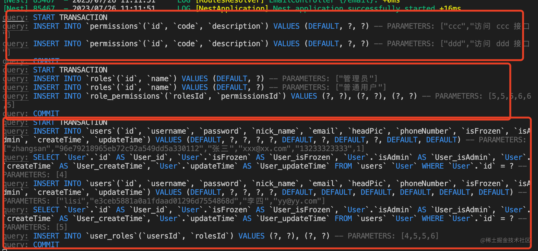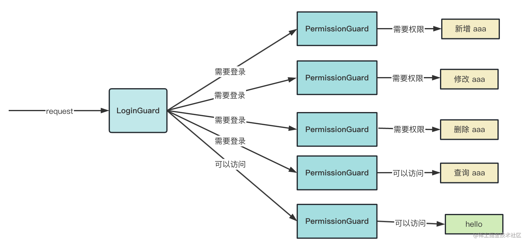 之后使用 LoginGuard、PermissionGuard 来做登录和权限的鉴权,根据 handler 上的 metadata 来确定要不要做鉴权、需要什么权限。