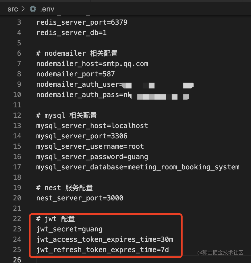 在 .env 里添加 redis、mysql、nodemailer 和 nest 服务的配置: