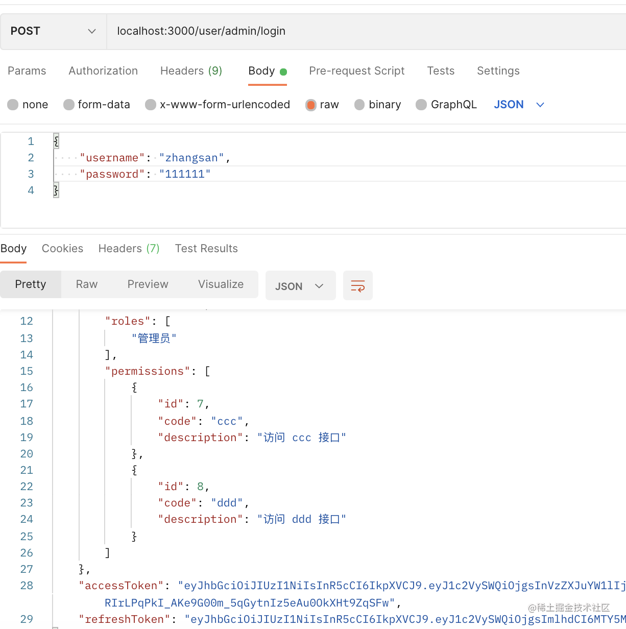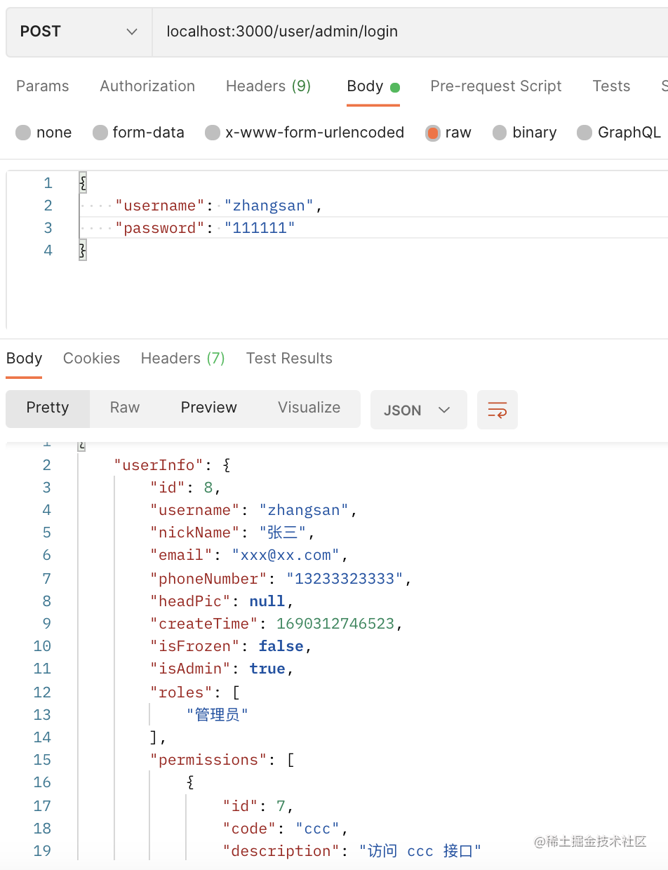 登录成功之后,返回 access_token、refresh_token 还有用户信息、roles、permissions 等。