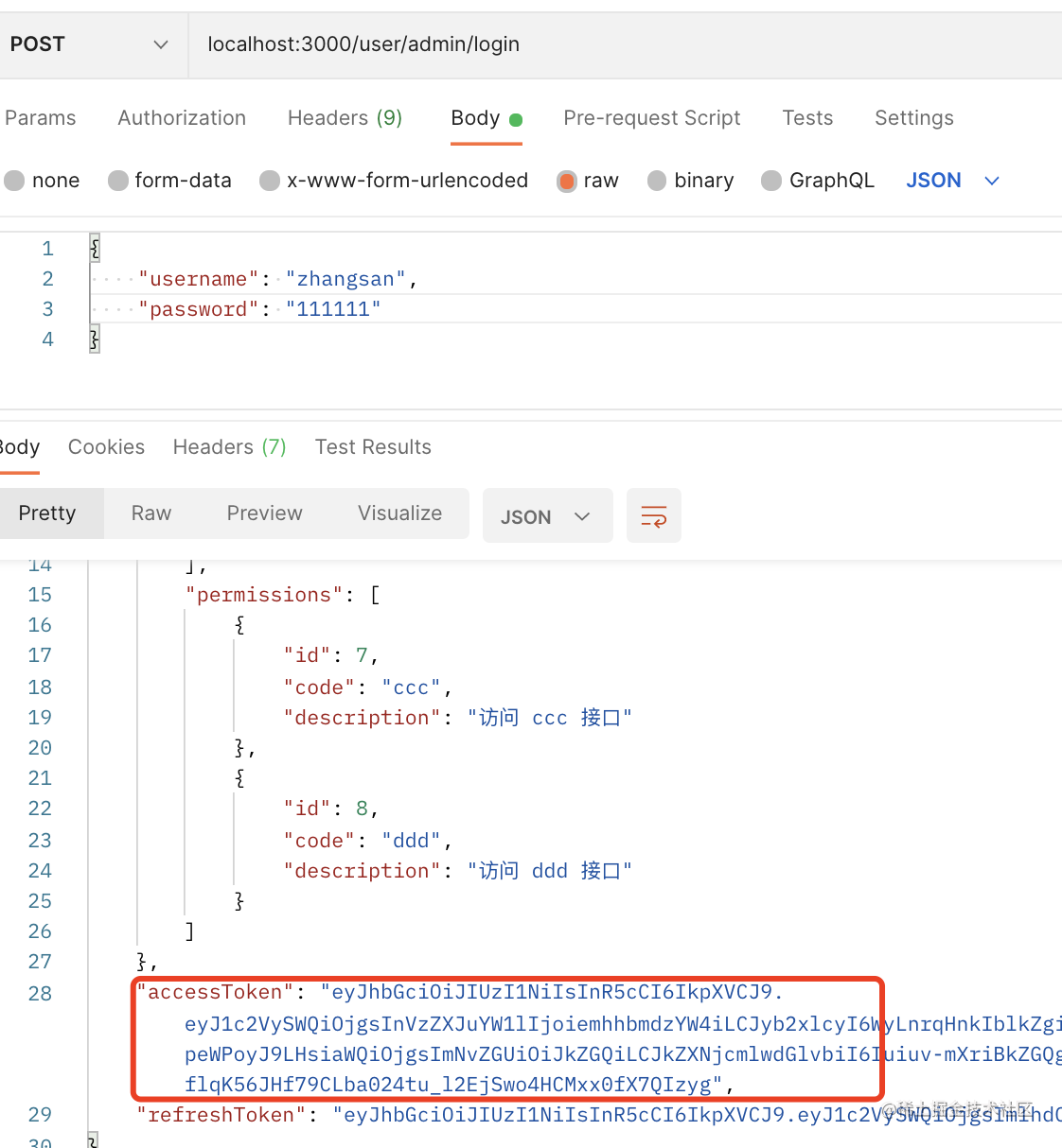 带上 accessToken,是可以访问 aaa 接口的,因为 zhangsan 有这个权限