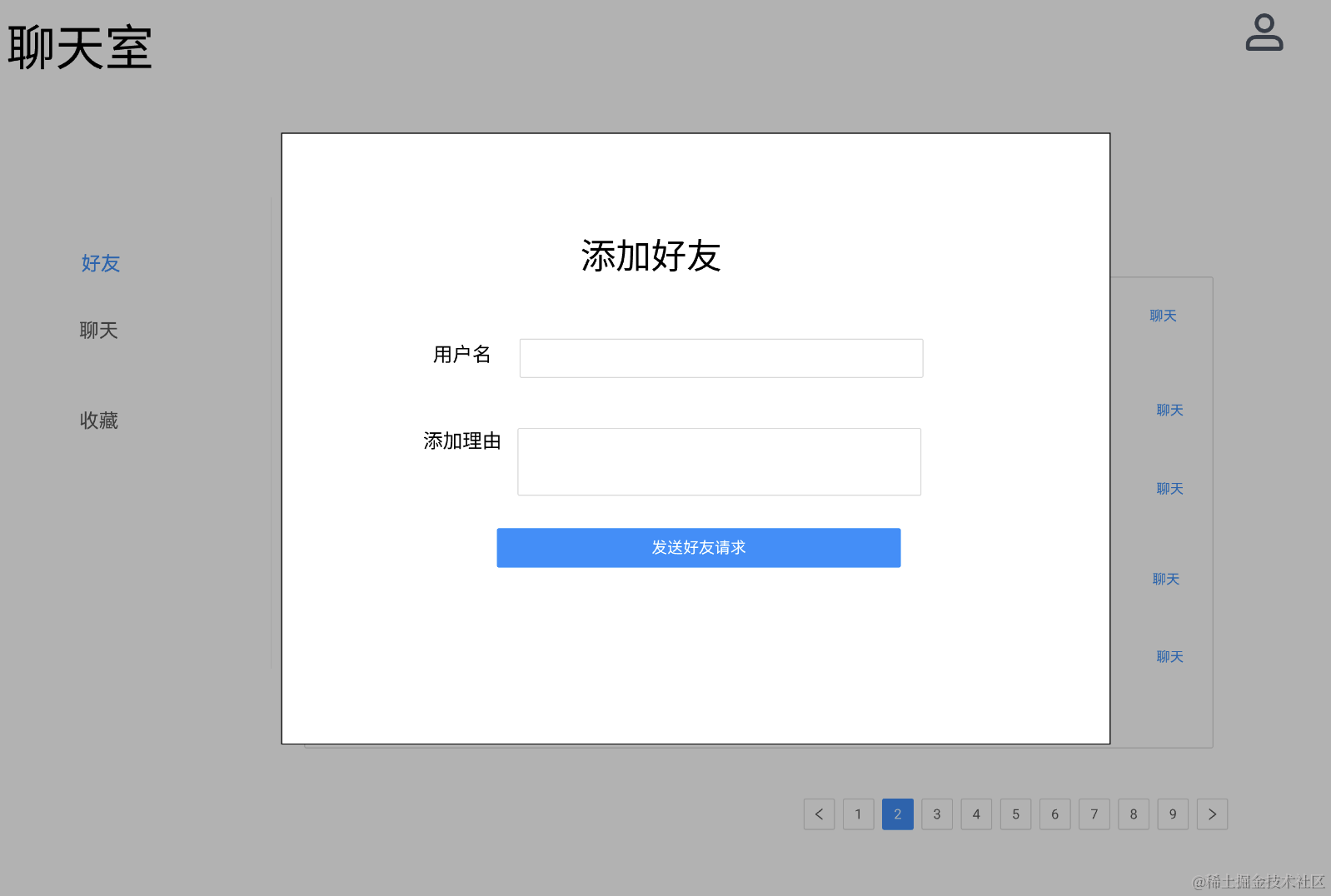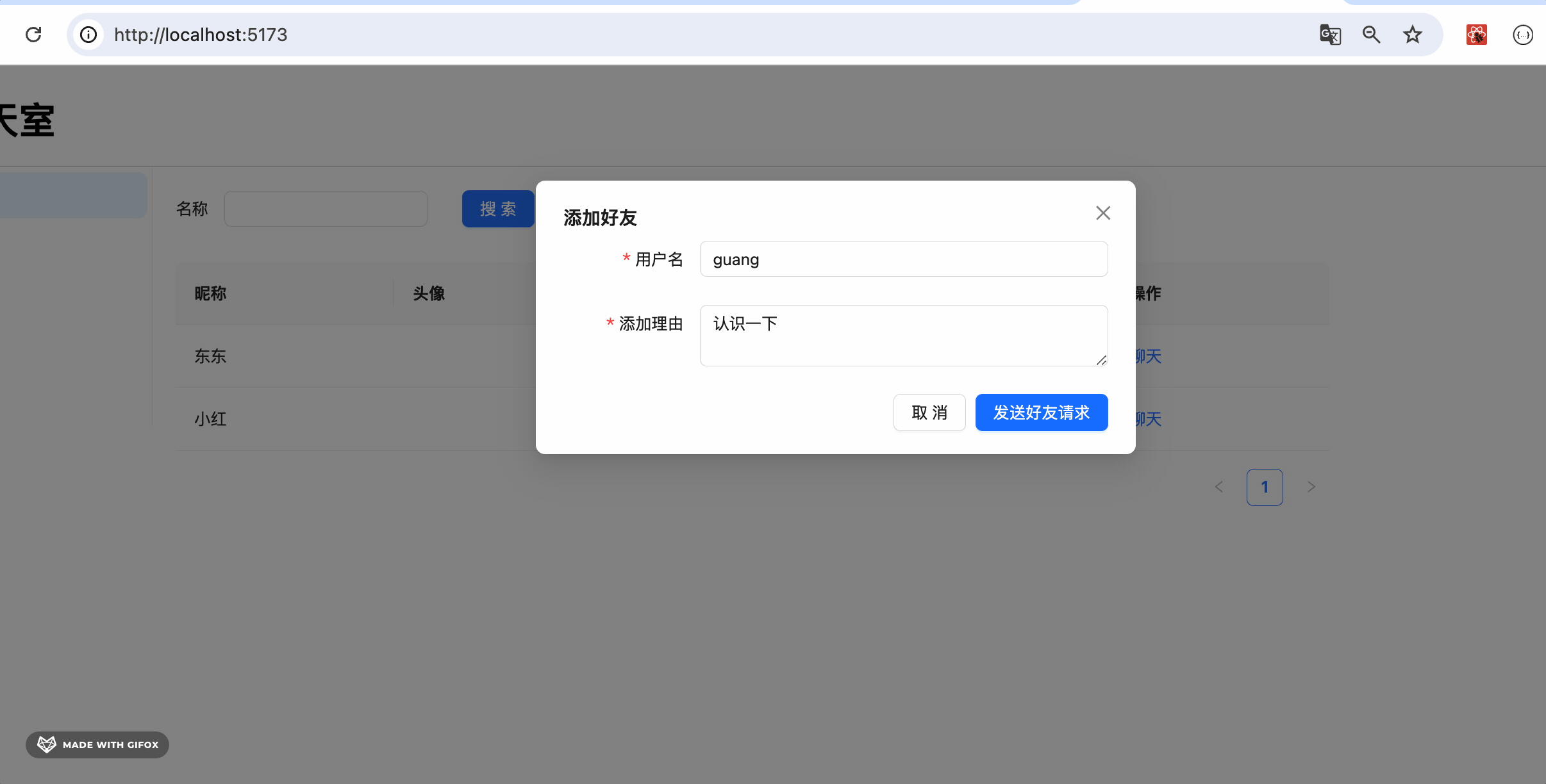 首先点击添加好友按钮的时候会有个弹窗,输入 username 和理由之后,会发送一个好友请求。