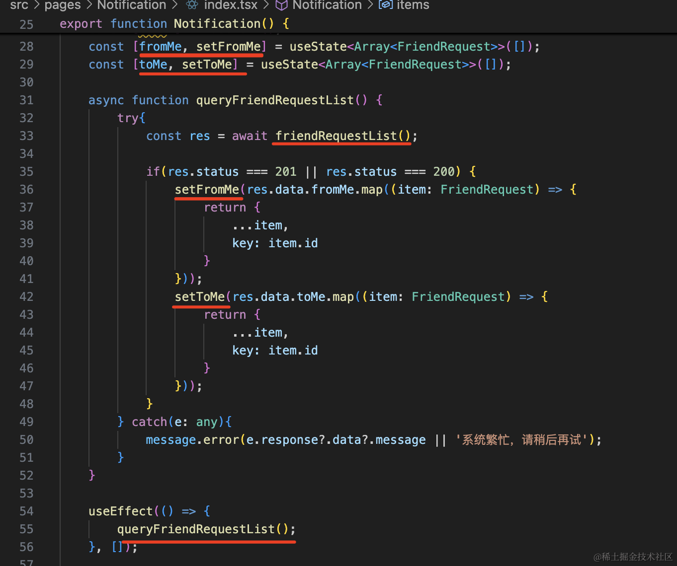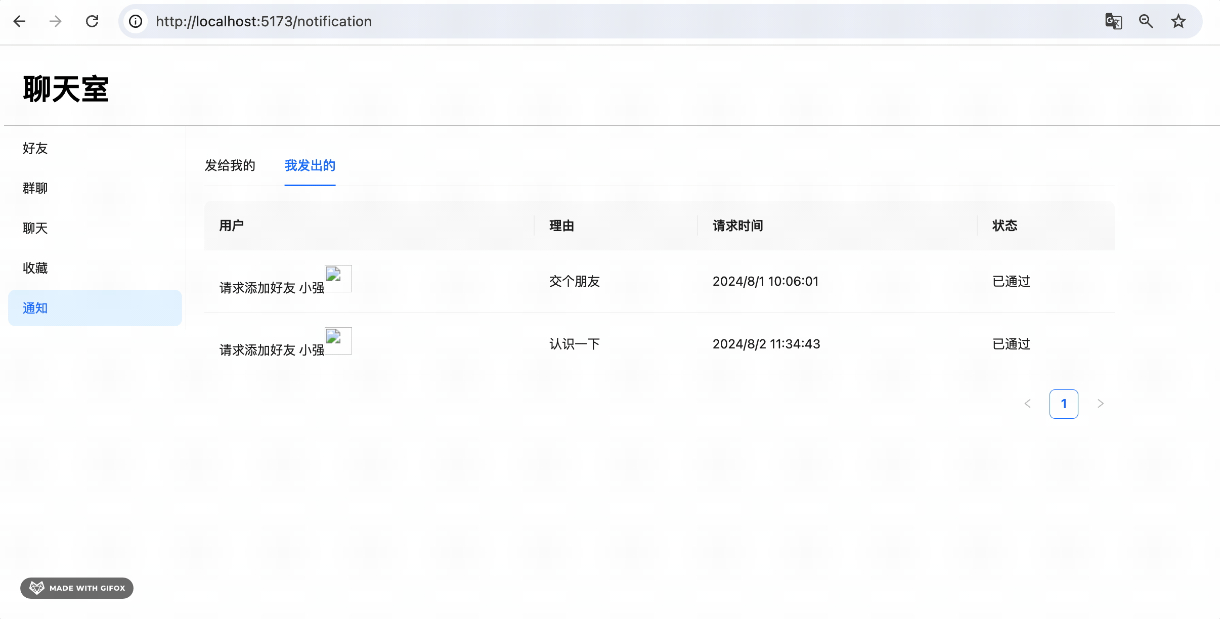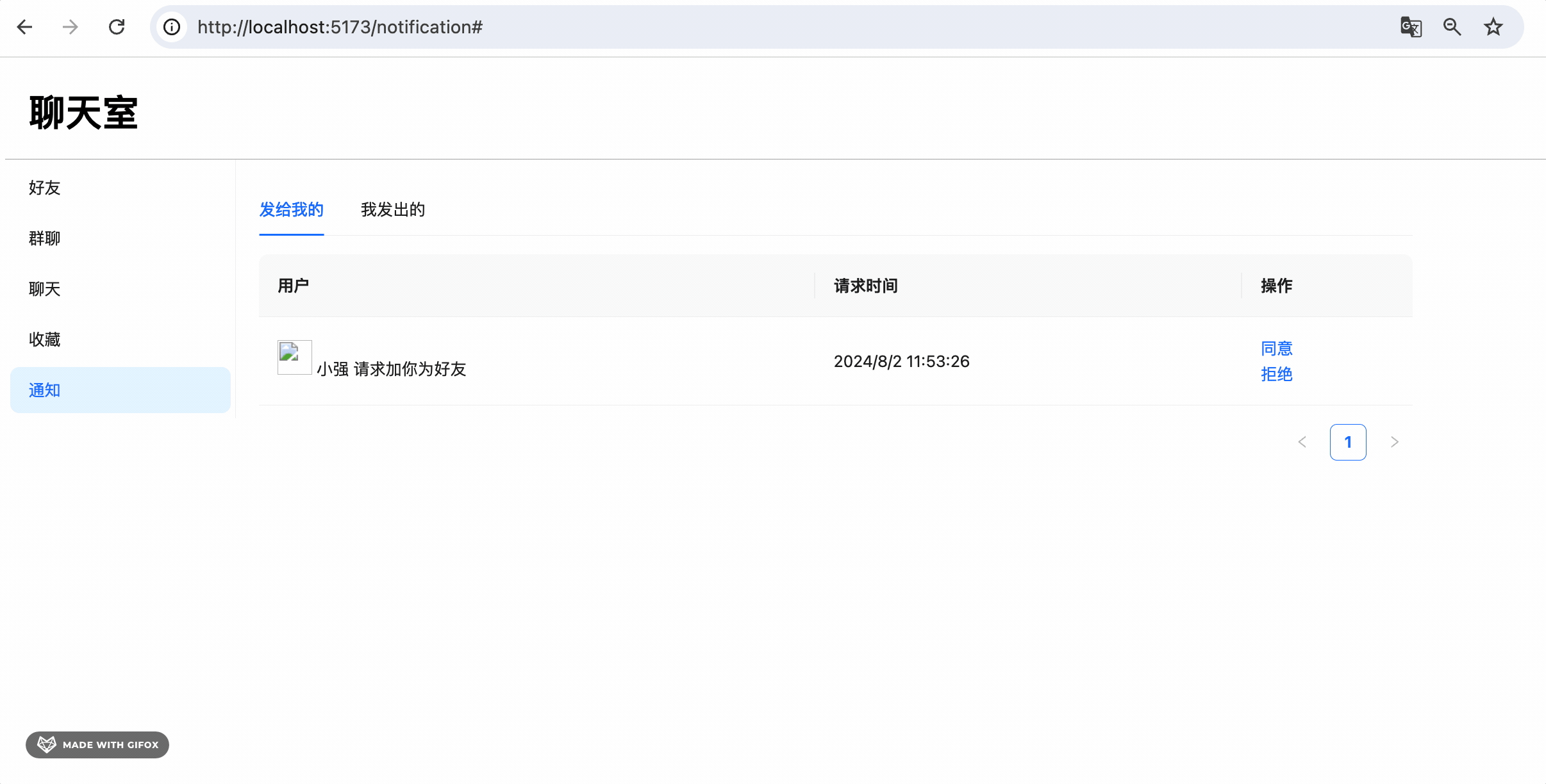 在通知页面分别展示发给我的和我发出的好友请求,对方点击同意后,就会成为好友了。