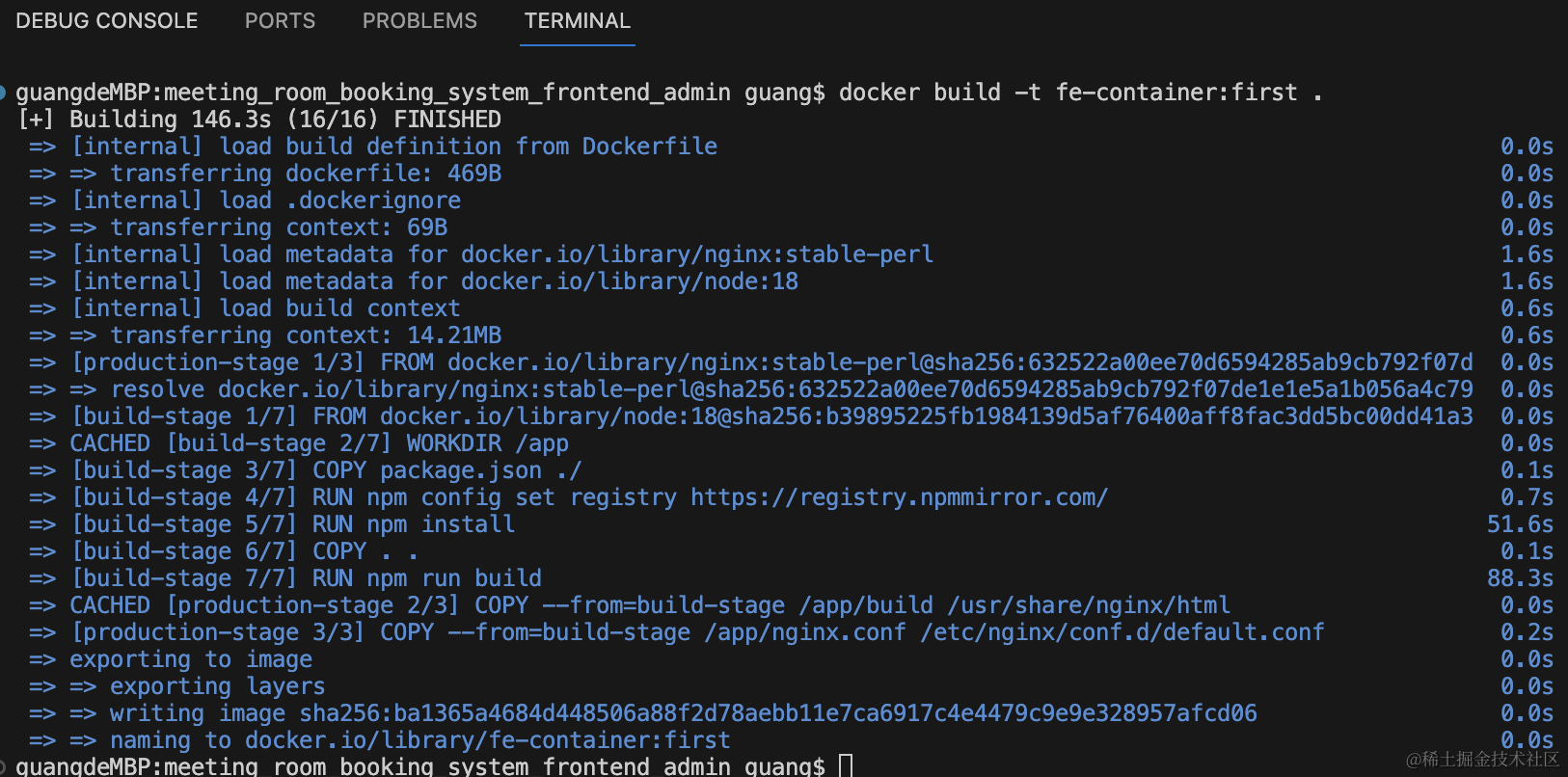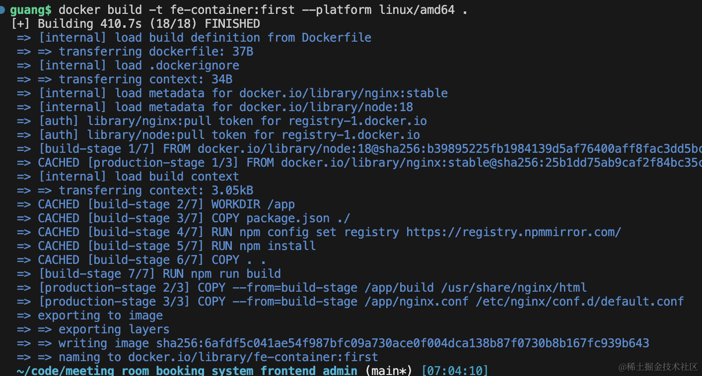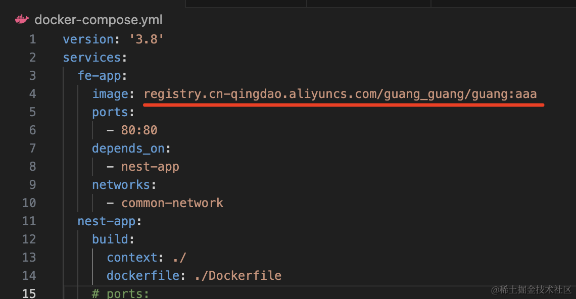 但是 fe-container 这个镜像只存在于本地,在阿里云跑 docker compose 的话会找不到这个镜像。