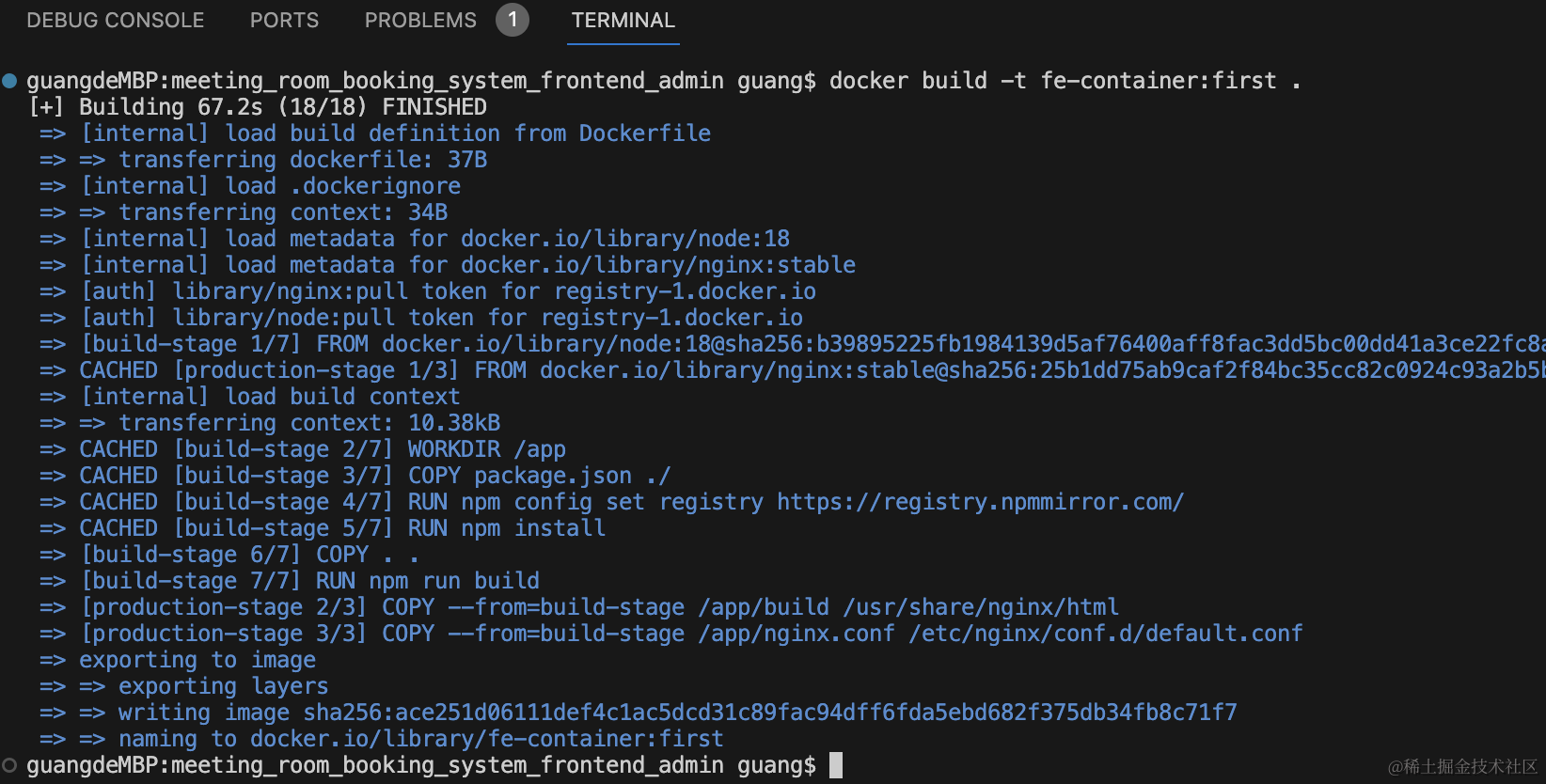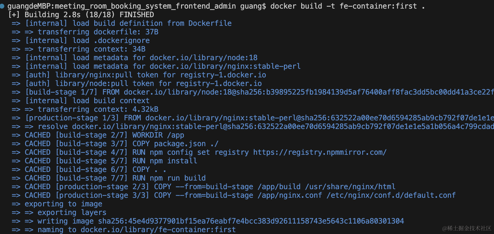 用多阶段构建,第一个阶段把代码复制到容器,执行 npm run build,第二个阶段把上个阶段的产物还有 nginx 配置文件复制过来,把 nginx 服务跑起来。