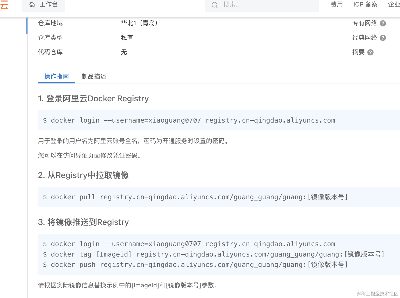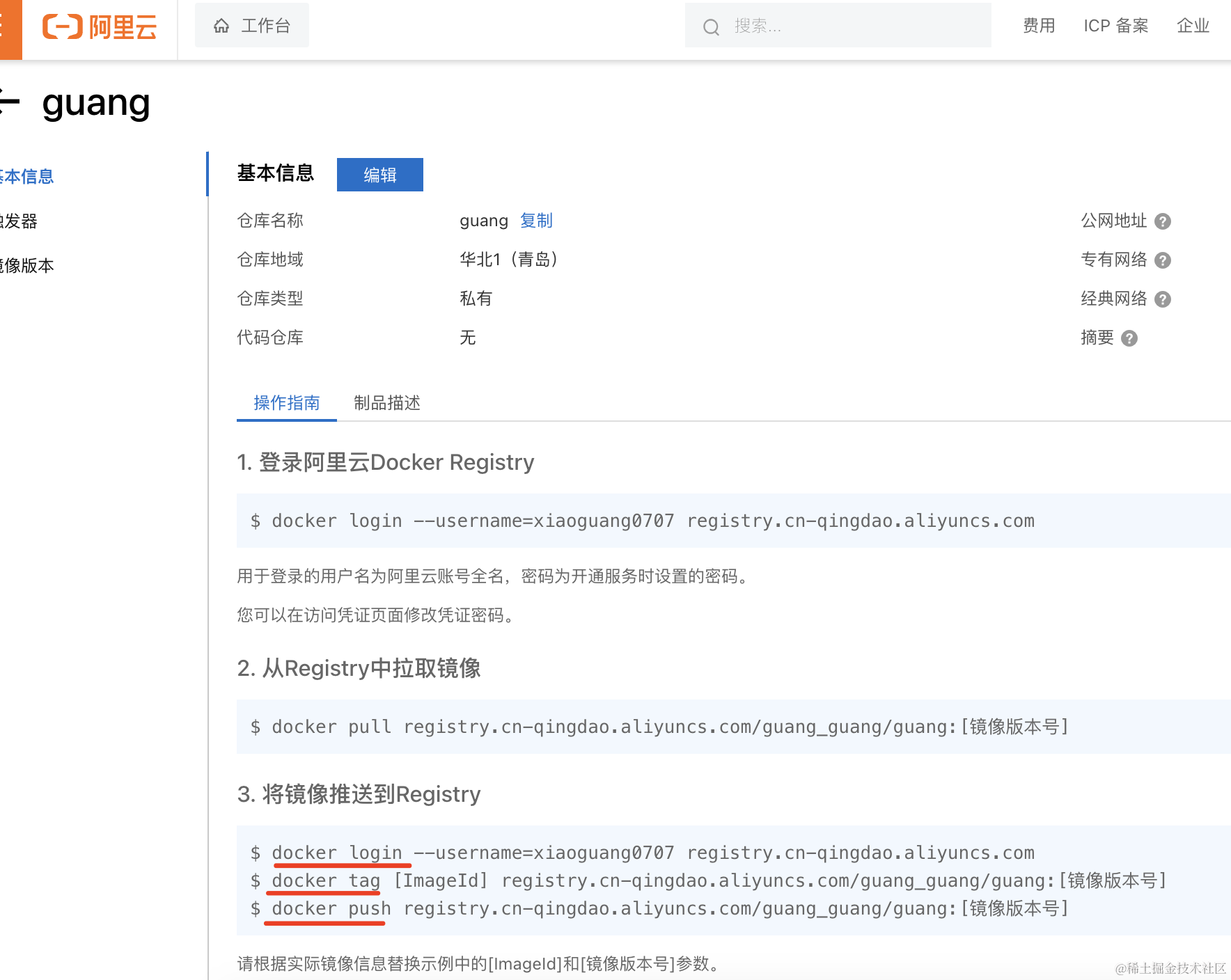 然后分别执行 docker login、docker tag、docker push 把镜像 push 到镜像仓库(直接复制命令就行):