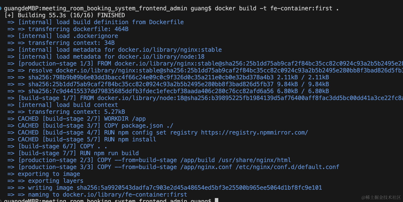 通过 Dockerfile 的多阶段构建,第一个阶段 npm run build 出产物,第二个阶段把产物和 nginx 配置文件复制过去跑 nginx 服务。