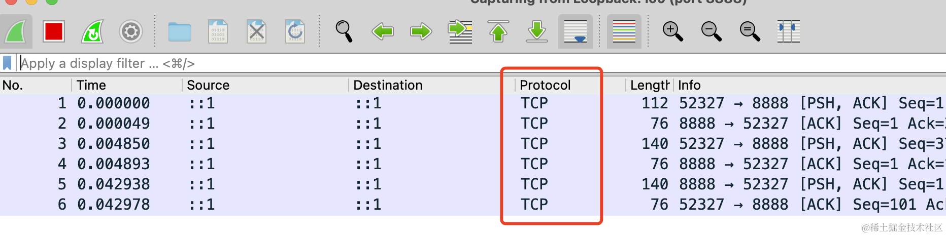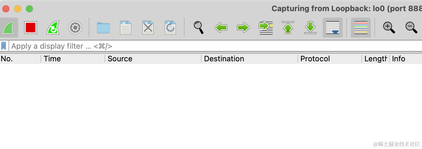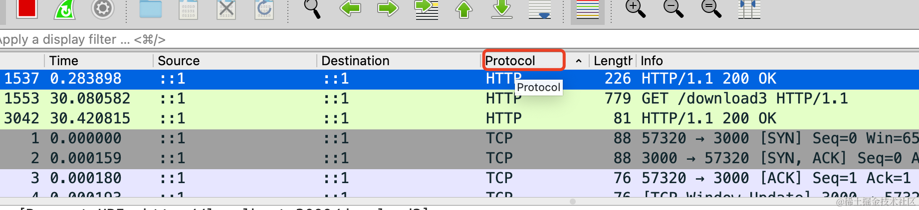 输入过滤器 port 3000,也就是过滤 3000 端口的数据包。