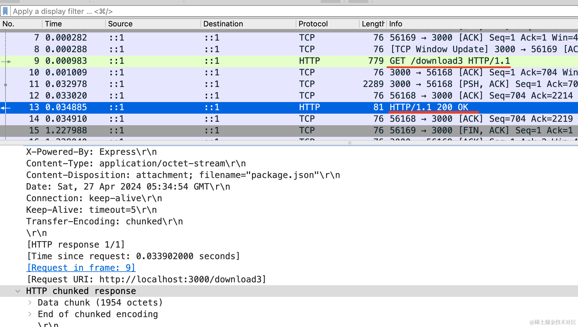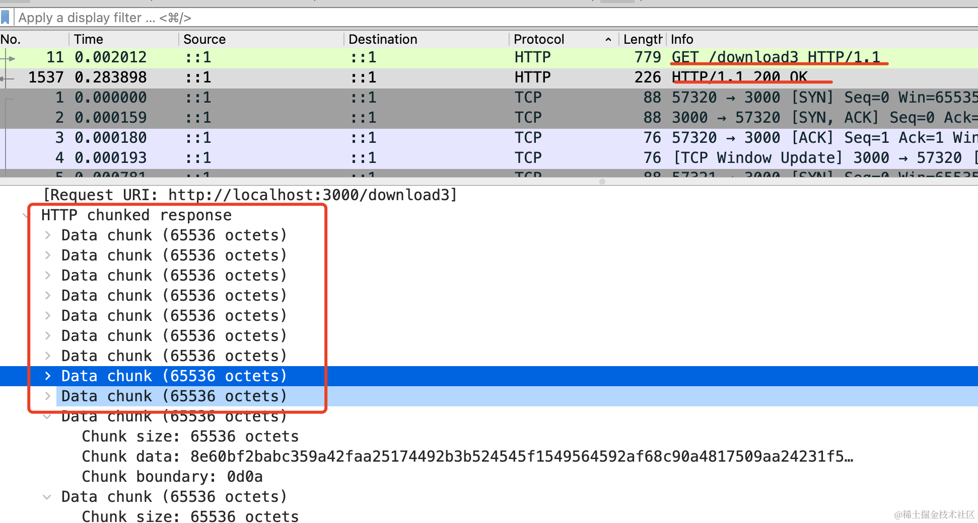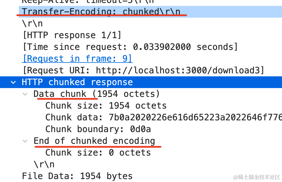 以后面试官再问你大文件下载优化或者问 transfer-encoding:chunked,你就可以大胆的说你用 wireshark 抓包验证过了。