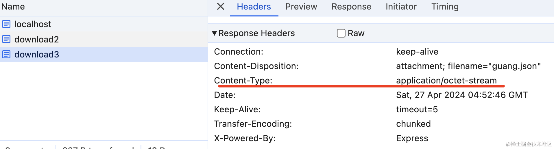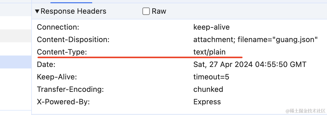 只是这里的 Content-Type 默认是 application/octet-stream 二进制流: