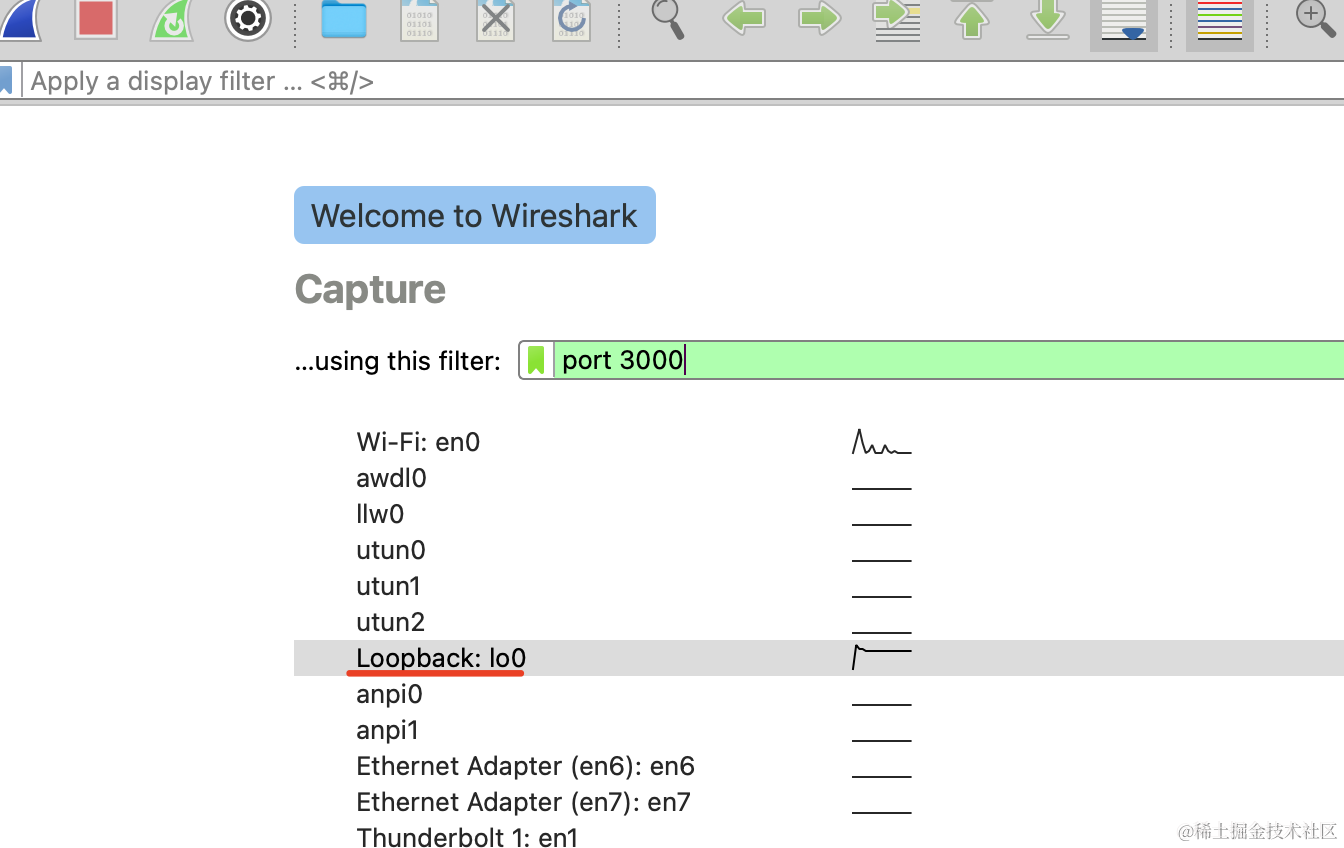 选择 loopback 这个网卡,本地回环地址,可以抓到 localhost 的包: