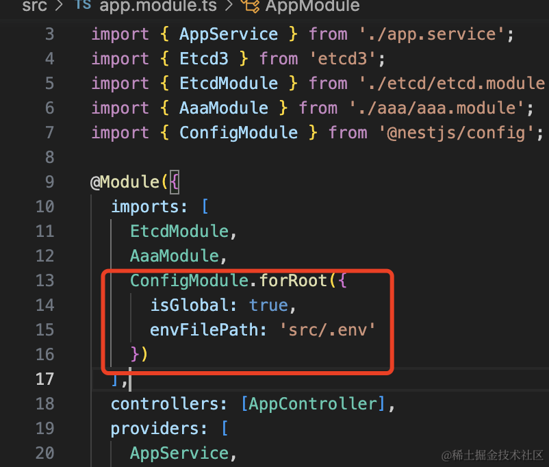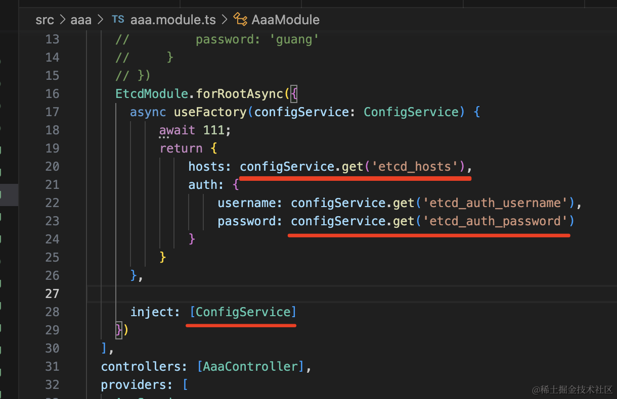 然后在引入 EtcdModule 的时候,从 ConfigService 拿配置: