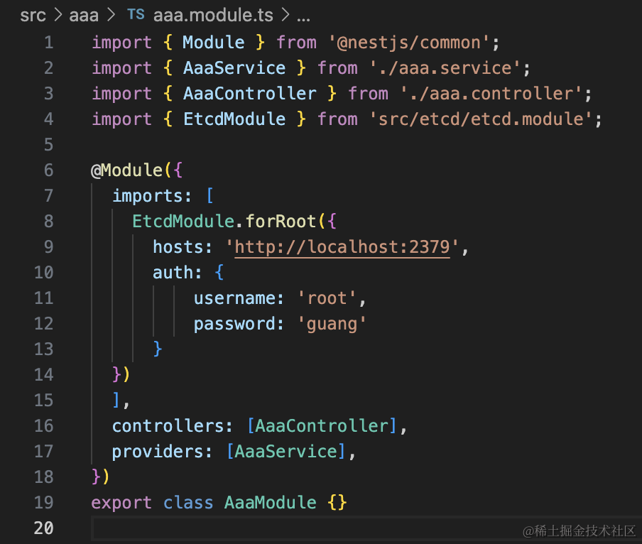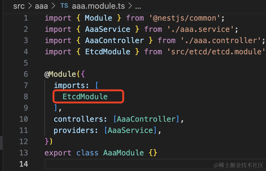 然后 AaaModule 引入 EtcdModule 的方式也改下: