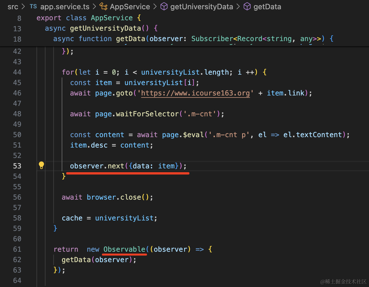 主要是返回一个 rxjs 的 Observable 然后不断用 observer.next 返回数据。