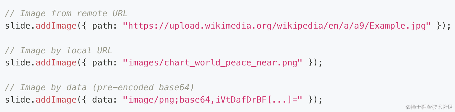 new 一个实例,添加一个 Slide,然后添加 text image 等内容,最后写入文件。