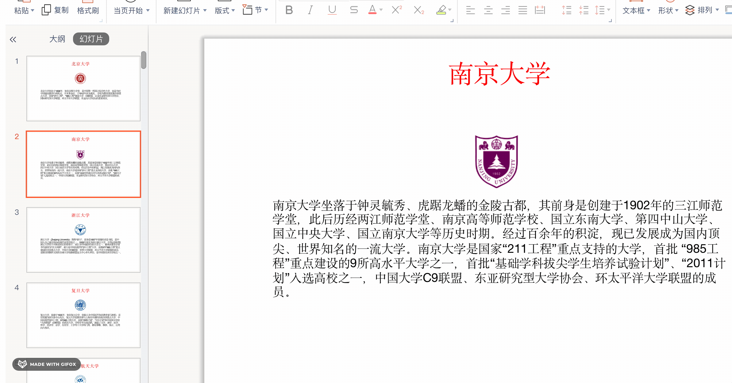 slide.addText(`北京大学创办于1898年,初名京师大学堂,是中国第一所国立综合性大学,也是当时中国最高教育行政机关。辛亥革命后,于1912年改为现名。 学校为教育部直属全国重点大学,国家“211工程”、“985工程”建设大学、C9联盟,以及东亚研究型大学协会、国际研究型大学联盟、环太平洋大学联盟、东亚四大学论坛的重要成员。`,