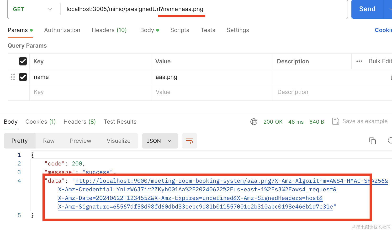可以看到,返回了 aaa.png 的预签名的 url,这样前端不需要 accessKey 也可以用这个 url 来上传文件到 minio 了。
