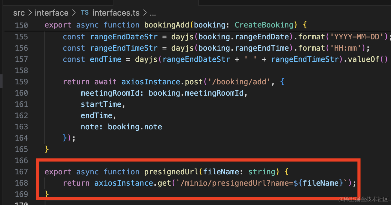 这里很显然就可以调用 presignedUrl 接口,拿到直传 minio 的 url。