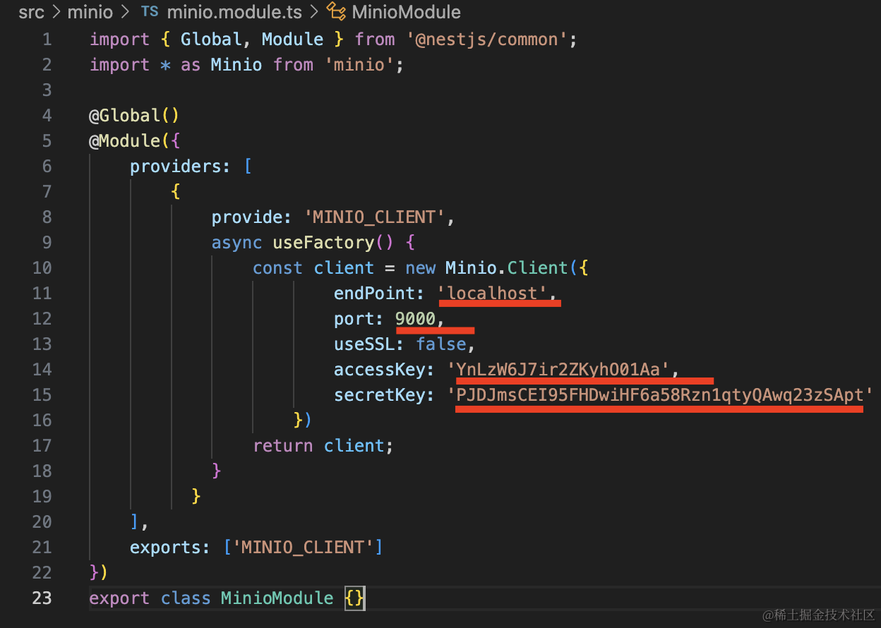 把 minio client 封装成 provider,放到 exports 里,并设置模块为 @Global。