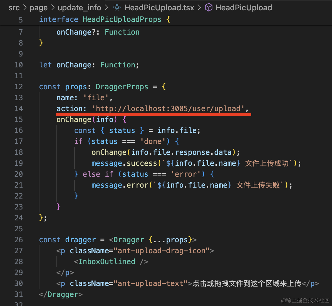 之前是指定了 action 参数,当选择文件后,antd 的 Dragger 组件会自动上传文件: