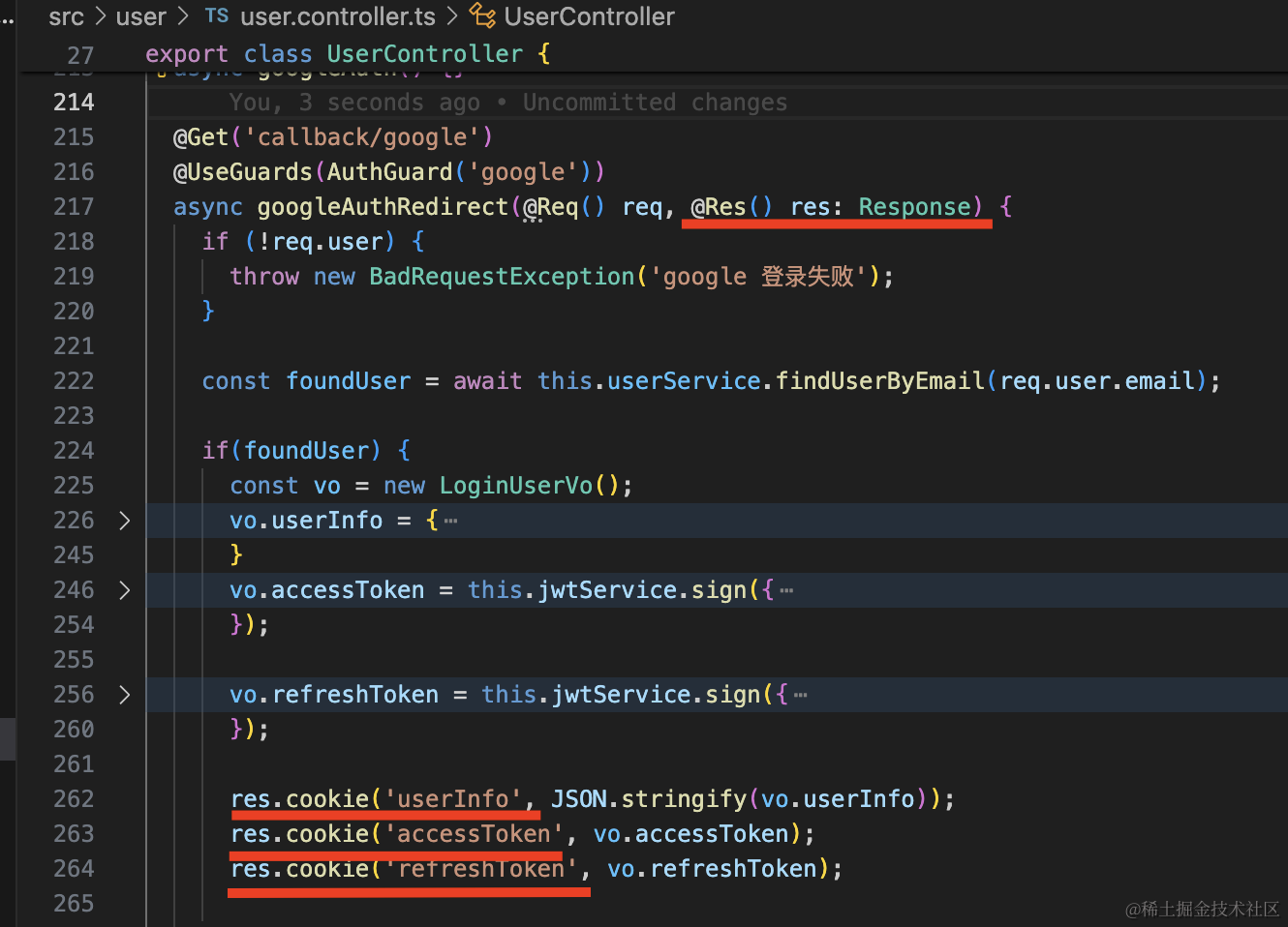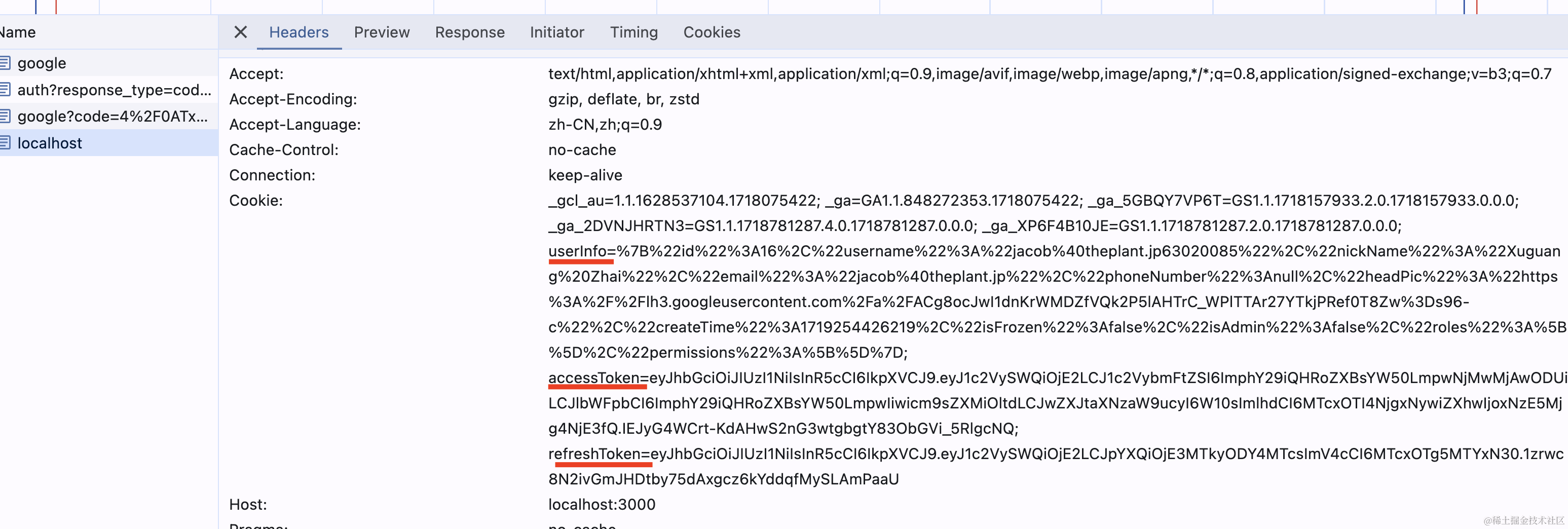 google 登录的 callback 里重定向到网站首页,然后通过 cookie 携带 userInfo、accessToken、refreshToken 等信息。