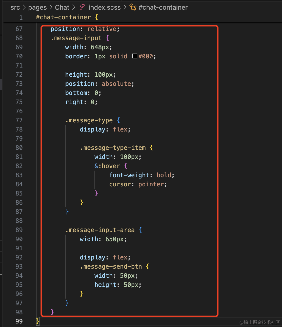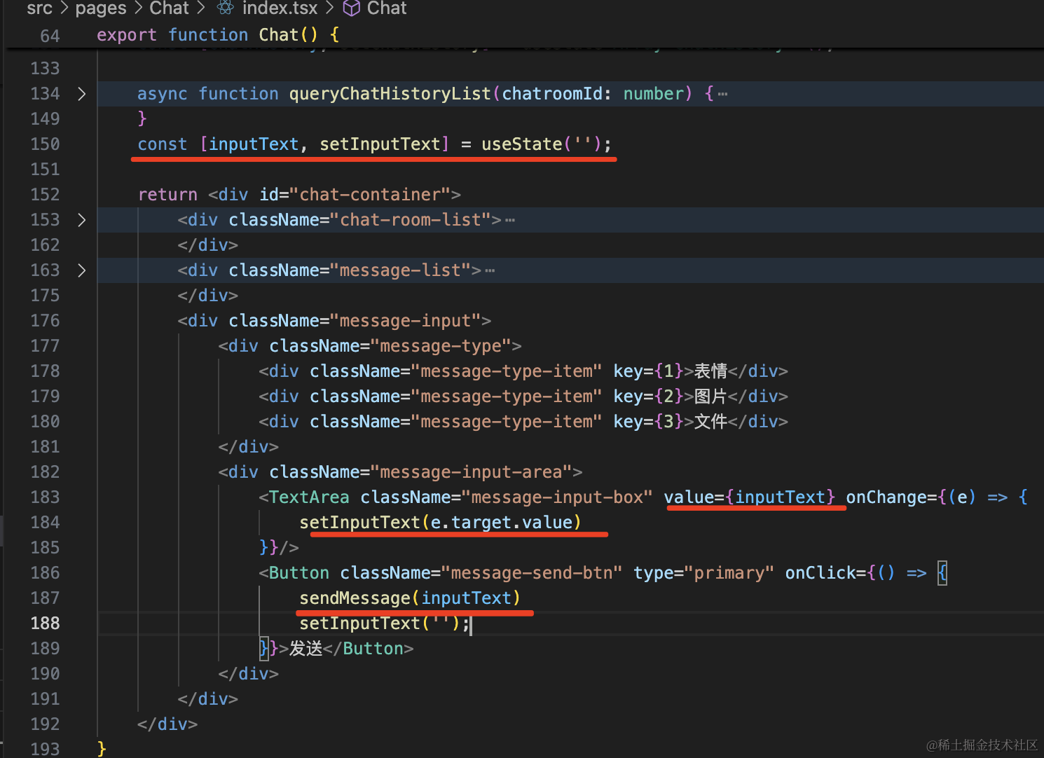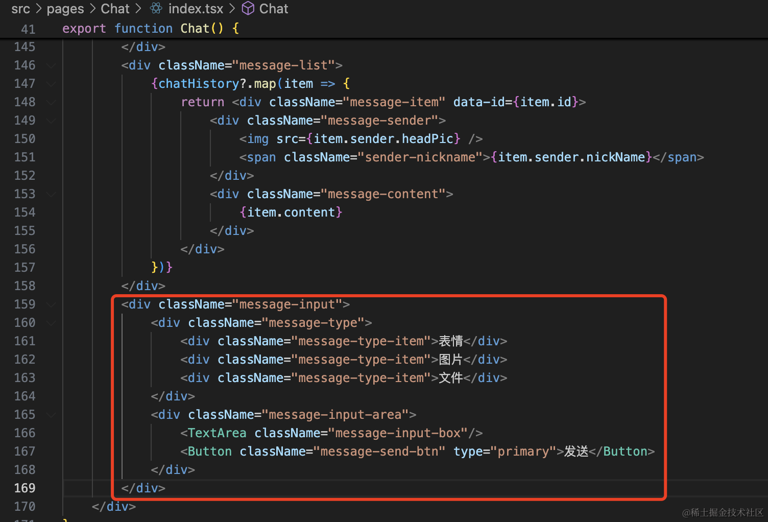 监听服务端的 message 消息,有新消息的时候添加到聊天记录里,并通过 scrollIntoView 滚动到底部。