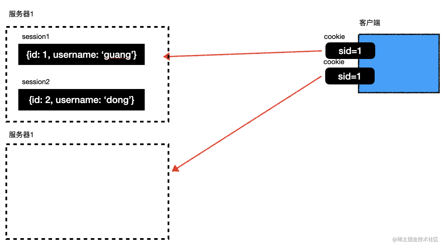 如图,因为请求自动带上 cookie,那两次请求就都可以找到 id 为 1 对应的 session,自然就知道当前登录的用户是谁,也可以存储其他的状态数据。