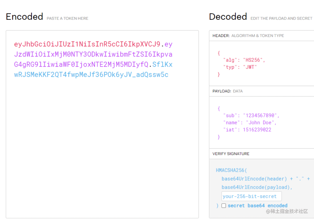 header 部分保存当前的加密算法,payload 部分是具体存储的数据,verify signature 部分是把 header 和 payload 还有 salt 做一次加密之后生成的。(salt,盐,就是一段任意的字符串,增加随机性)
