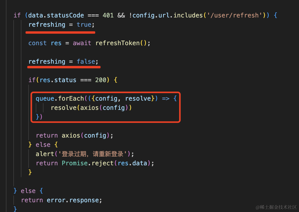 # 当 refresh 成功之后,修改 refreshing 的值,重新发送队列中的请求,并且把结果通过 resolve 返回。