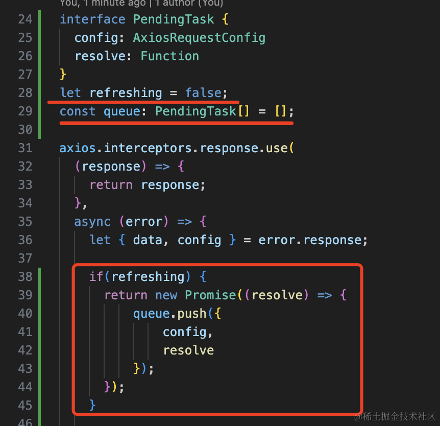 加一个 refreshing 的标记,如果在刷新,那就返回一个 promise,并且把它的 resolve 方法还有 config 加到队列里。