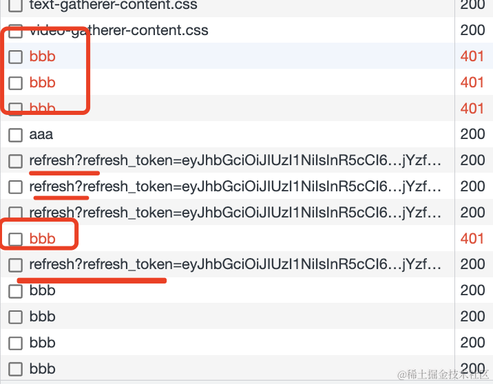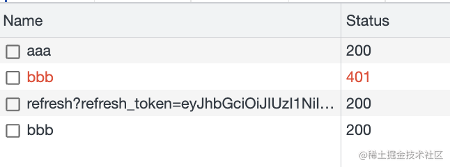 访问了 aaa、bbb 接口,bbb 接口 401 了,于是 refresh token,之后再次访问 bbb。