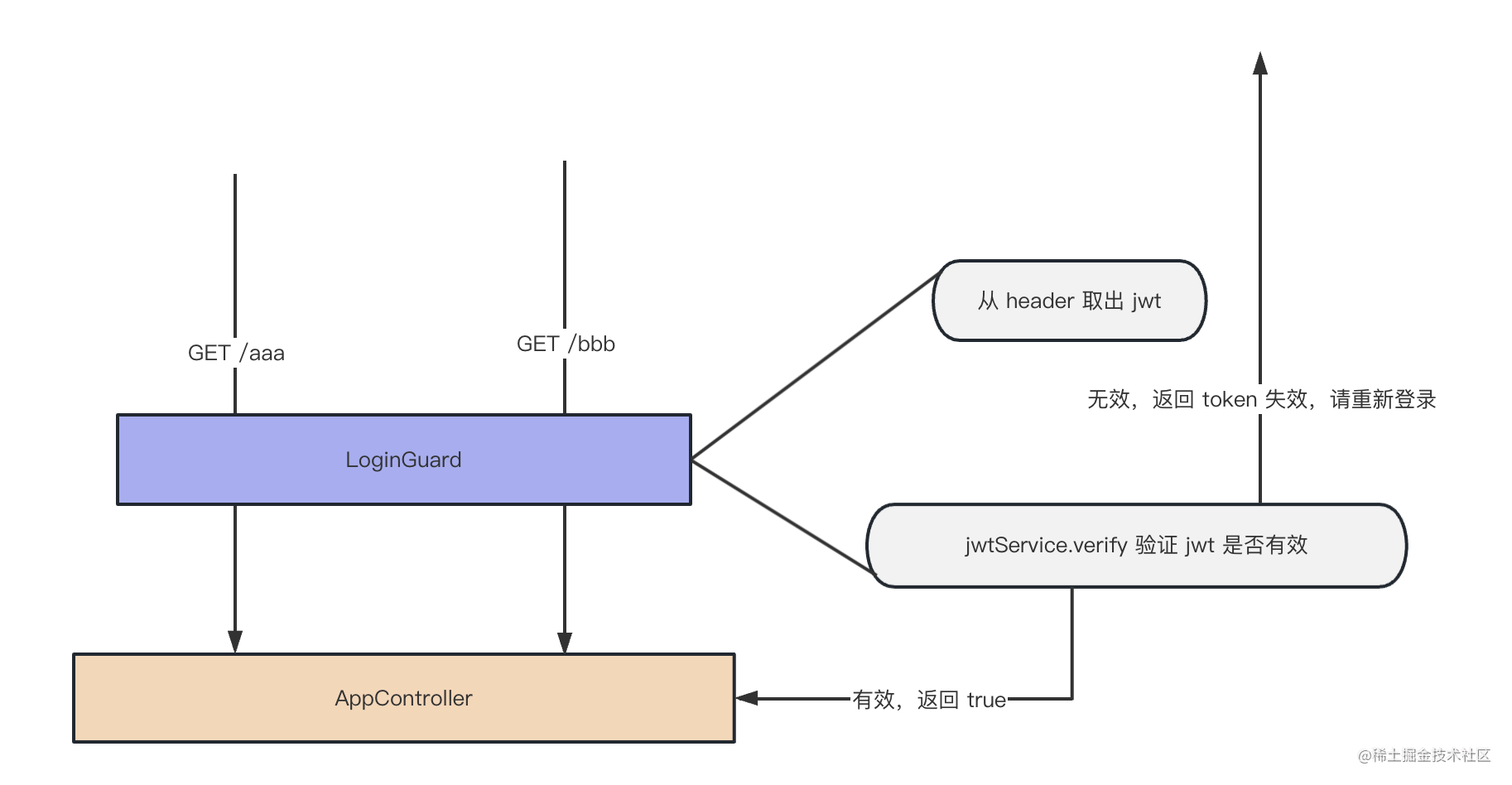访问接口的时候带上 jwt,在 Guard 里取出来判断是否有效,有效的话才能继续访问: