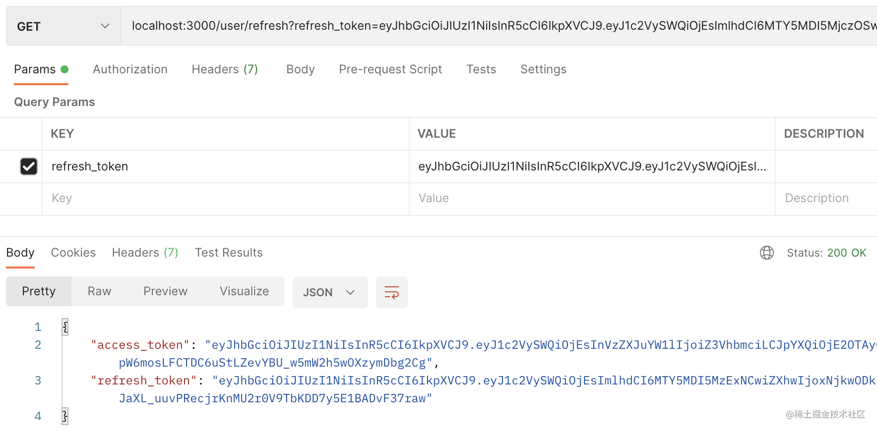 这样 7 天内,如果 access_token 过期了,那就可以用 refresh_token 刷新下,拿到新 token。